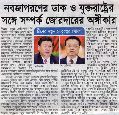 দেশের প্রধান প্রধান দৈনিকগুলোতে সচিত্র প্রকাশিত হয়েছে এ খবর। দেশের সর্বাধিক প্রচারিত সংবাদপত্র প্রথম আলোর সচিত্র সংবাদের শিরোনাম ছিল, চীনের নতুন নেতৃত্বের ঘোষণা: নবজাগরণের ডাক ও যুক্তরাষ্ট্রের সঙ্গে সম্পর্ক জোরদারের অঙ্গীকার। চায়না লিডারস কল ফর গ্রেট রেনেসাসে- ছিল দেশের অন্যতম প্রধান ইংরেজি দৈনিক দি ডেইলি স্টারের সচিত্র সংবাদের শিরোনাম।