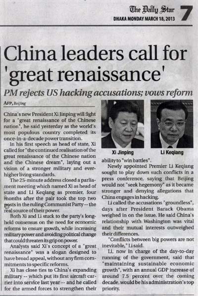 এছাড়াও ইত্তেফাক, সমকাল, যুগান্তর, ইংরেজি দৈনিক নিউএজ, ইন্ডিপেন্ডেন্টসহ প্রায় সবকটি প্রধান সংবাদপত্রে এসেছে খবরটি। ইত্তেফাকের সচিত্র শিরোনাম: স্বপ্নের চীন দেখতে চান সি চিন পিং। সমকালের শিরোনাম: জাগরণের ডাক দিলেন প্রেসিডেন্ট সি চিন পিং।